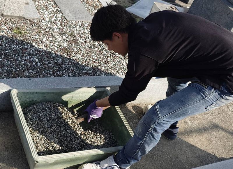 今月はお墓参りに来られる方に加えて、工事に入る仲間の姿も多く見かける久米山です。