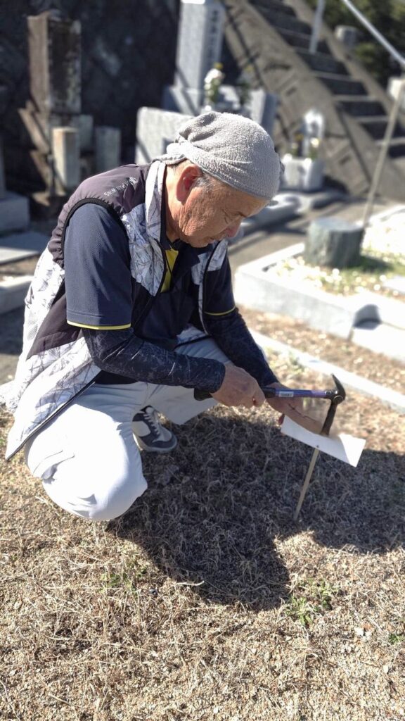 この日も、38年ぶりに訪れたお客様をご案内していました。長い年月が経ち、ご自分の区画がわからなくなってお困りだったそうです。無事にお墓を見つけていただいた後、大西さんは黙々と区画のネームプレートを設置していました。